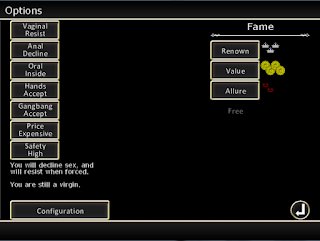 Fun fact: Early in development, I considered having the mind stat correlate to how easy it was to become upset. An intelligent character would get upset more easily and find it harder to look past everything in front of her, while a less intelligent character would care less about consequences and be easily entertained. I never implemented this, because there isn't yet enough of a bonus to having a high mind score at the moment outside of making extra cash at locations that would be more oriented towards intelligence than sex work or labor.
